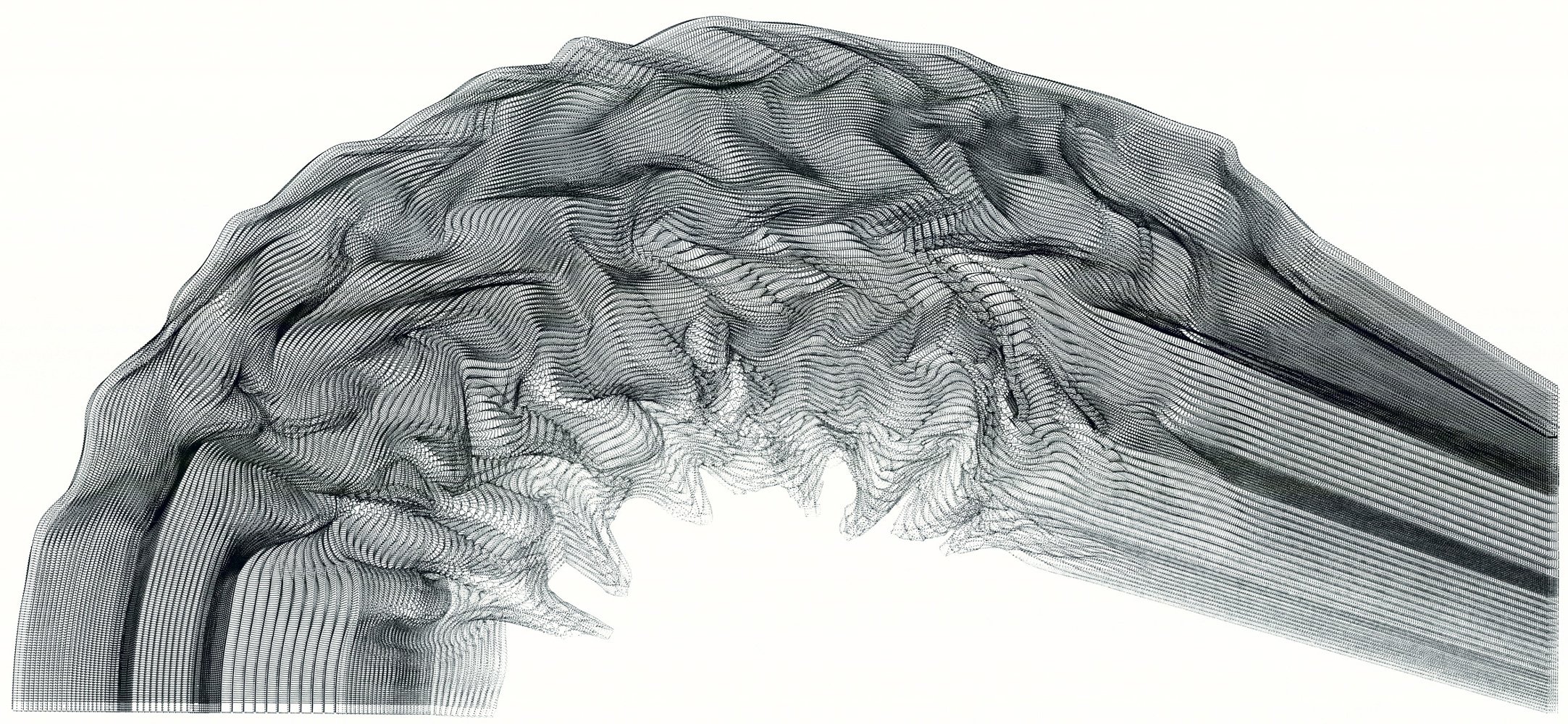 Figuration: Method BB uses 2-D Bezier curves with two layers of hierarchy. Major curves are set with respect to compositional agendas. Minor curves are interpolated between major curves. Lines are drawn based on curve geometry at points along each curve. In set BB-001 each curve is divided evenly. At each division point rectangles are generated based on the position and local curvature. Each rectangle is assigned an incremented depth value as though it were recessed into the page slightly higher than the previous rectangle. Lower rectangles are occluded by earlier and higher rectangles. In run 004, the lines of the rectangle are drawn so as to not quite meet at the comers. Occluded lines are not drawn except for a momentary, contact point with the paper at each end point. A fresh black pen was used for both the lines and points. The large size–and duration–of this drawing leads to the pen's deterioration over its course.