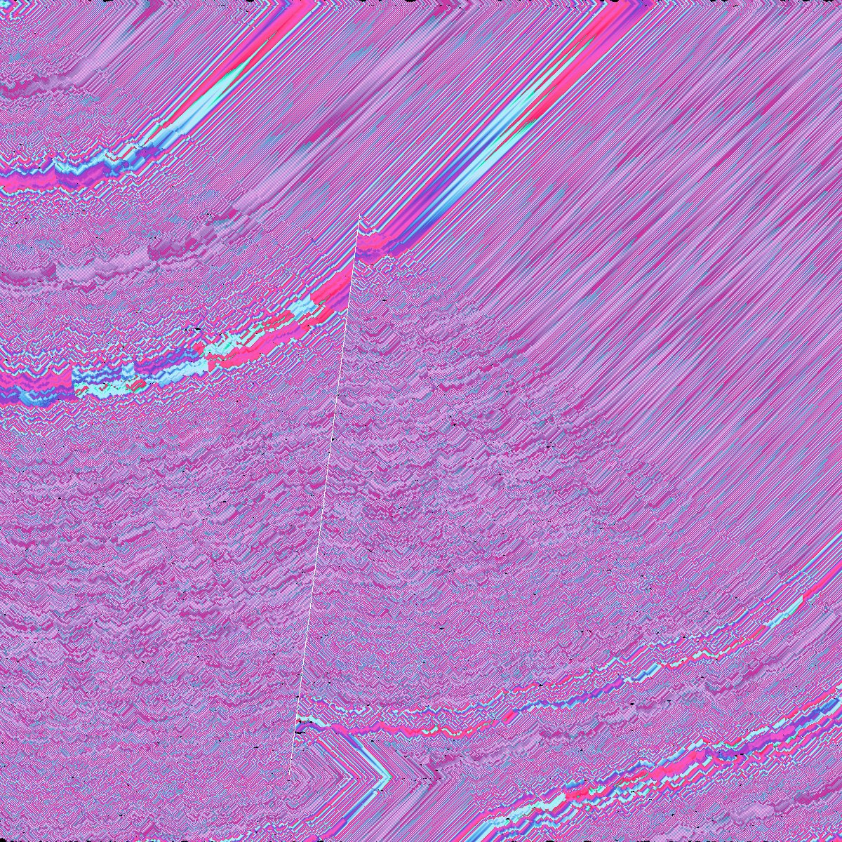 Every digital image is a grid. This fact is both obvious and easy to ignore. But this structure affords opportunities for operations like sorting a series of pixels (columns, in this case) based on any color value (hue, in this case). Sorting pixels through the use of custom-created software is willfully naive of the content represented in the image. This can yield strange effects when the content legible in the image deviates from a gridded order (as is the case in this line drawing) or if the pixels are chromatically varied in local territories (as is the case with a noisy image or one that was purposefully dithered or optimized for compression).